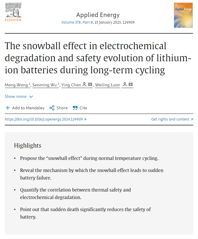 華東理工大學(xué)欒偉玲教授團(tuán)隊(duì)在Applied Energy(IF:11)發(fā)表題為《The snowball effect in electrochemical degradation and safety evolution of lithium-ion batteries during long-term cycling》的研究論文,該成果由華東理工大學(xué)先進(jìn)電池系統(tǒng)與安全重點(diǎn)實(shí)驗(yàn)室(CPCIF)、機(jī)械與動(dòng)力工程學(xué)院等機(jī)構(gòu)聯(lián)合支持。