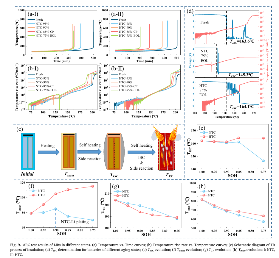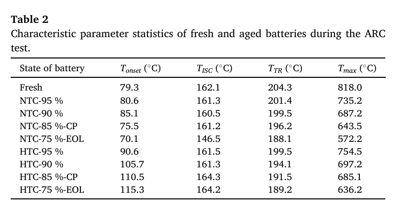 ② 在常溫循環(huán)老化的線性和加速衰減階段,熱失控特性表現(xiàn)出不同趨勢(shì)。在線性衰減階段,絕熱溫升持續(xù)時(shí)間縮短,但在加速衰減階段沒(méi)有顯著變化。Tonset在線性衰減階段略有升高,但在加速衰減階段迅速降低。