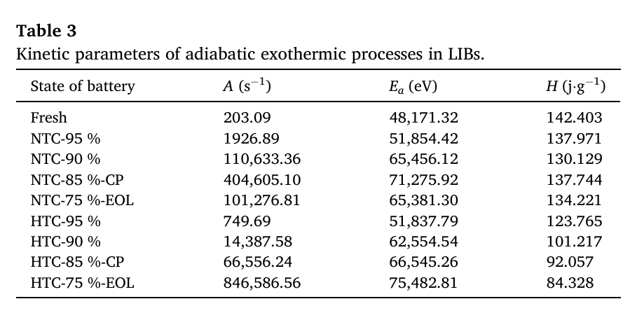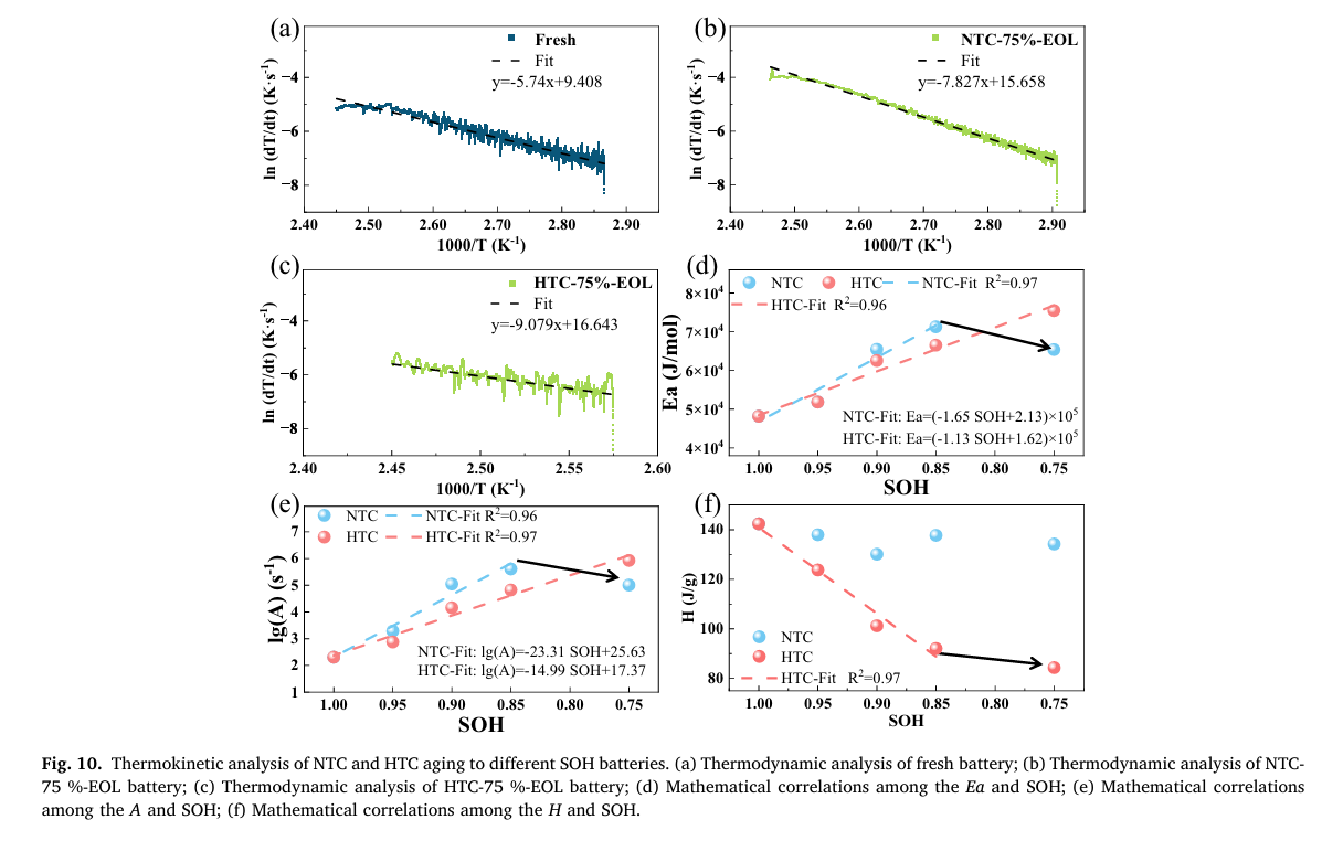 為進(jìn)一步分析老化引起的電池?zé)岚踩宰兓?,該研究結(jié)合小型電池絕熱量熱儀BAC-90A的測(cè)試結(jié)果對(duì)電池絕熱溫升過(guò)程進(jìn)行了動(dòng)力學(xué)分析。結(jié)合dT/dt特性曲線,采用Arrhenius等方程計(jì)算,獲取了常溫循環(huán)和高溫循環(huán)條件下不同老化狀態(tài)電池的放熱反應(yīng)動(dòng)力學(xué)參數(shù)。揭示了活化能Ea與電池SOH之間的關(guān)系。結(jié)果表明,對(duì)于高溫循環(huán)和常溫循環(huán)的線性老化階段,Ea值隨著SOH的降低而單調(diào)遞增。