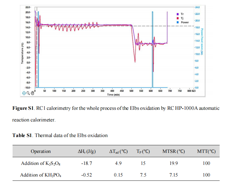 Elbs氧化反應(yīng)是GL-V9合成的首個(gè)關(guān)鍵步驟。研究團(tuán)隊(duì)利用RC HP-1000A自動(dòng)反應(yīng)量熱儀,成功獲取了該反應(yīng)過程中的比放熱焓(ΔHr)、絕熱溫升(ΔTad)、失控最高溫度(MTSR)等核心熱風(fēng)險(xiǎn)參數(shù)。基于這些數(shù)據(jù),不僅驗(yàn)證了Elbs氧化工藝的安全性,更為該工藝?yán)鋮s系統(tǒng)的選型及操作規(guī)范的制定提供了定量依據(jù)。